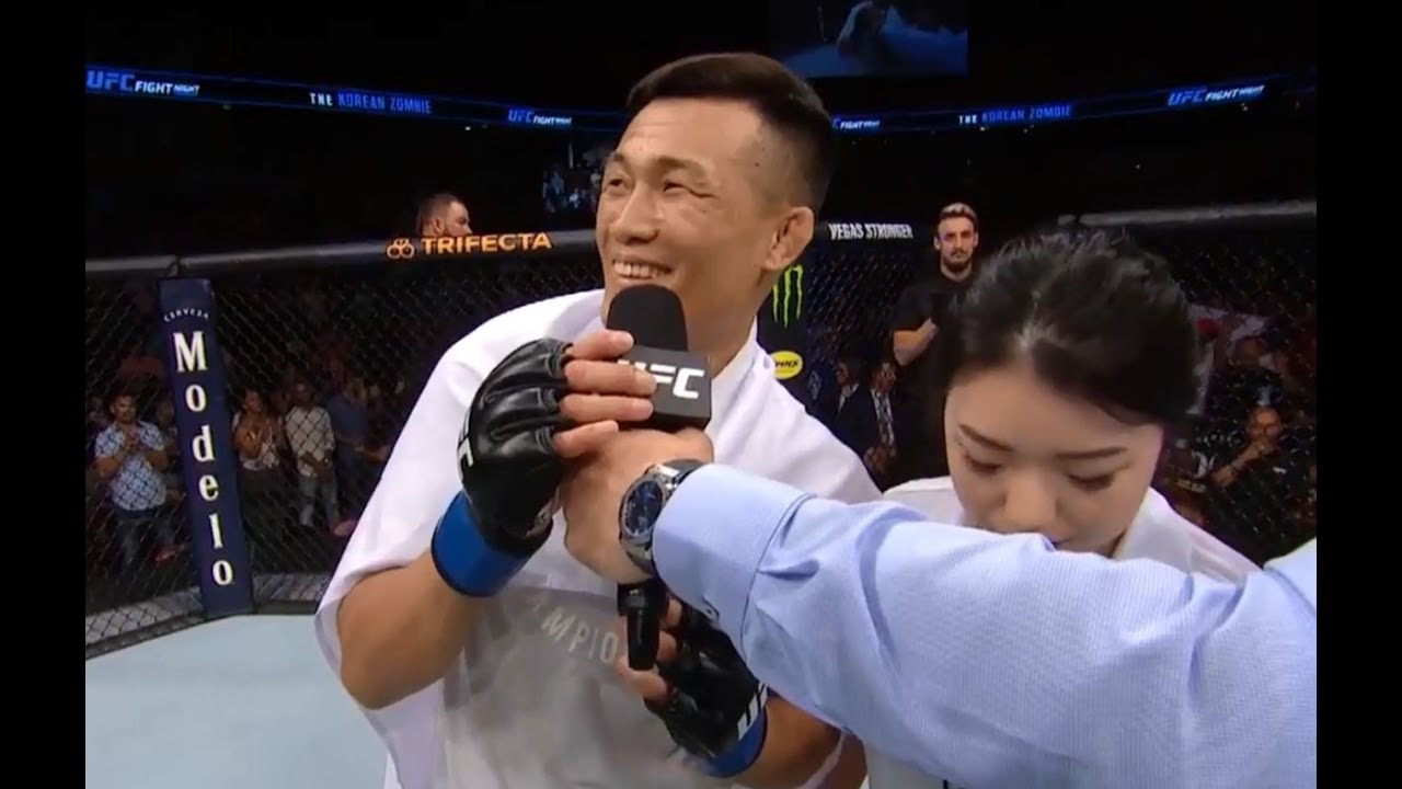 Chan Sung Jung, aka “The Korean Zombie,” talks with Michael Bisping after his impressive first round finish in the main